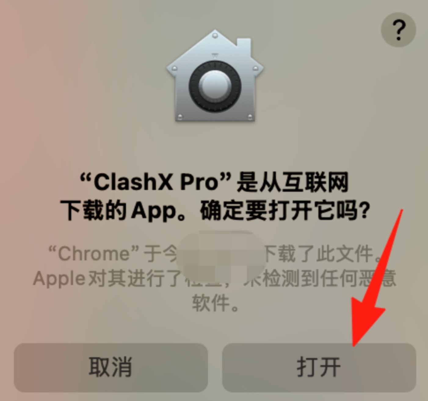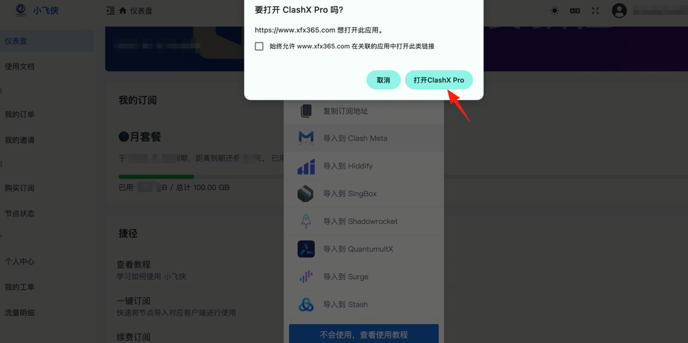 此时,会自动弹出 <打开 Clash 客户端> 的提示框。点击 <打开ClashX Pro> 按钮。