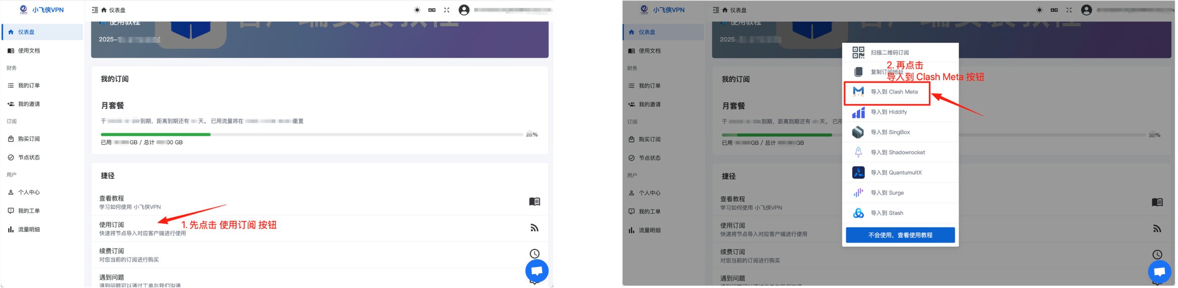 进入到 小飞侠 首页,点击右下位置的 <使用订阅> 按钮。在出现的弹框中,点击 <导入到 Clash Meta> 按钮。