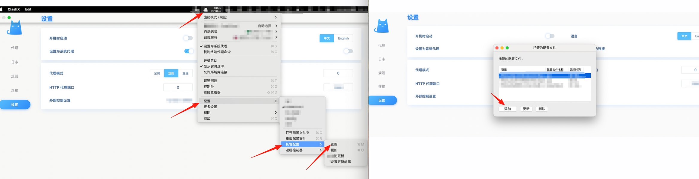 打开 <小飞侠客户端(ClashX)> 的 <主菜单>,依次点击 <配置 -> 托管配置 -> 管理> 按钮。在出现的 <托管的配置文件> 弹框中,点击 添加 按钮。