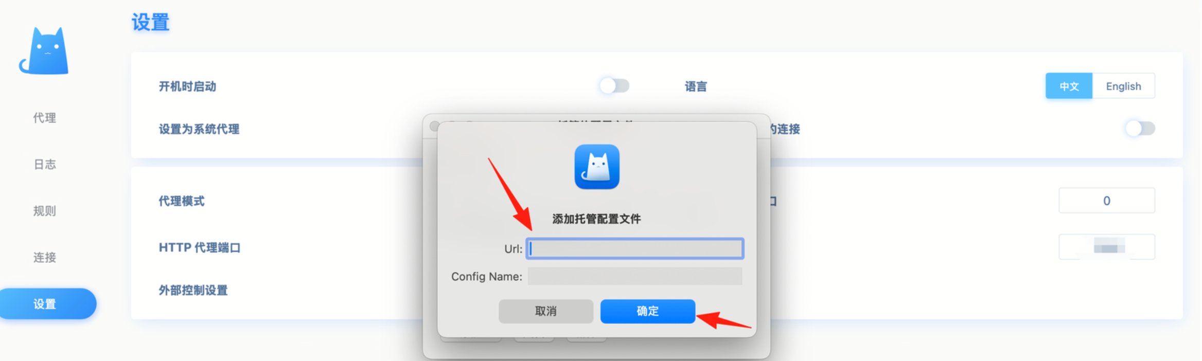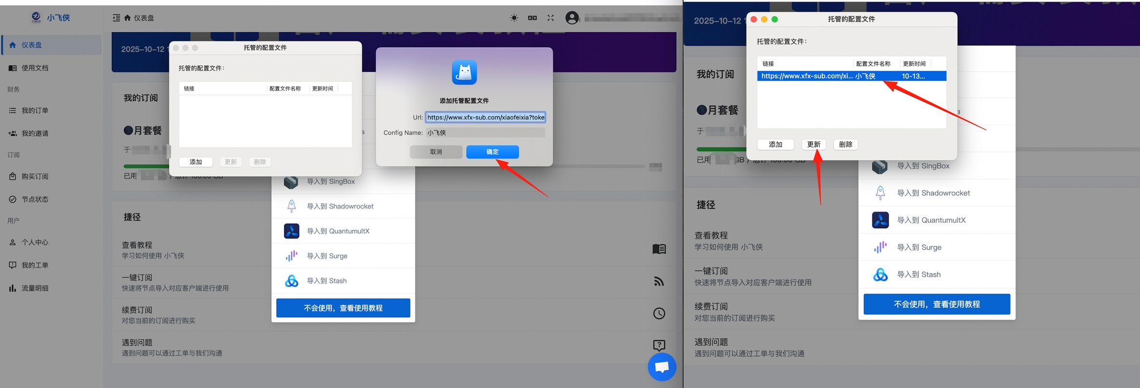 在 <小飞侠客户端(ClashX)> 弹出的 <添加托管配置文件> 界面,点击 <确定> 按钮。完成后,再点击下面的 <更新> 按钮,即成功导入了订阅链接。