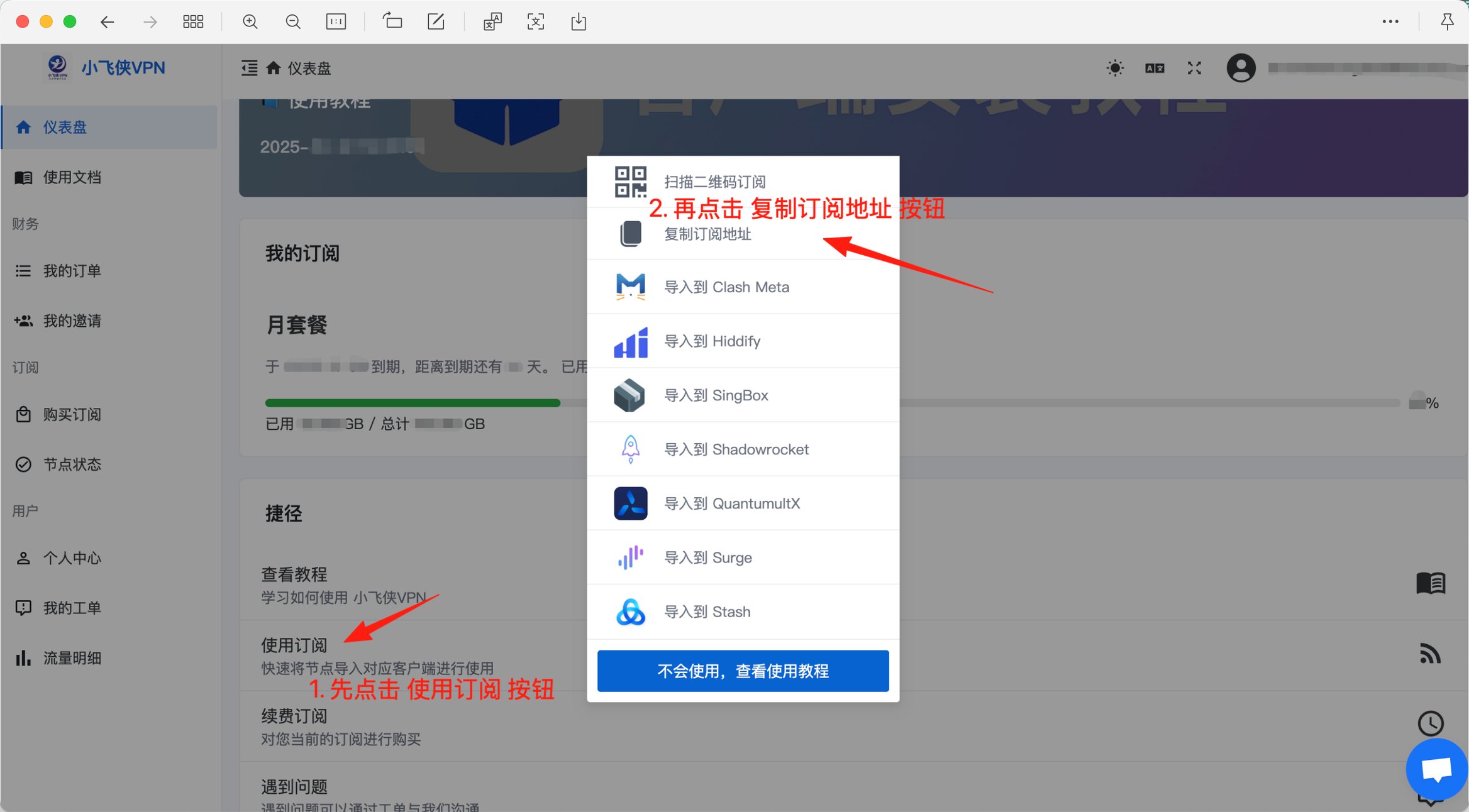 进入到 小飞侠 首页,点击右下位置的 <使用订阅> 按钮。在出现的弹框中,点击 <复制订阅地址> 按钮。
