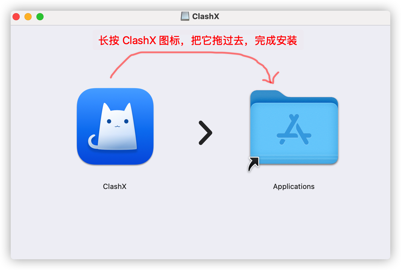打开下载的 ClashX.dmg 文件,将 ClashX 拖拽到 Applications文件夹 中,完成安装。image.png