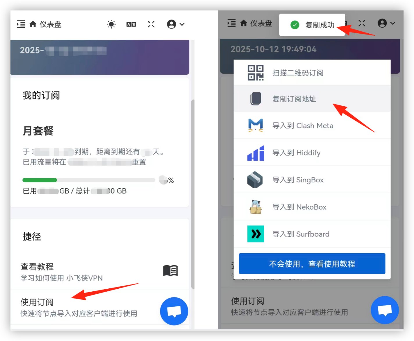 进入到 小飞侠 首页,点击 <使用订阅> 按钮,在出现的弹框中,再点击 <复制订阅地址> 按钮。