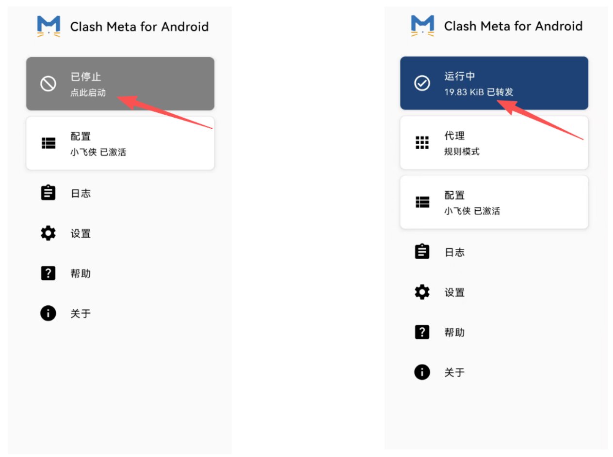 进入 <小飞侠客户端(Clash Meta for Android)应用的首页>,点击 <最上面的启动项>,开启订阅服务。