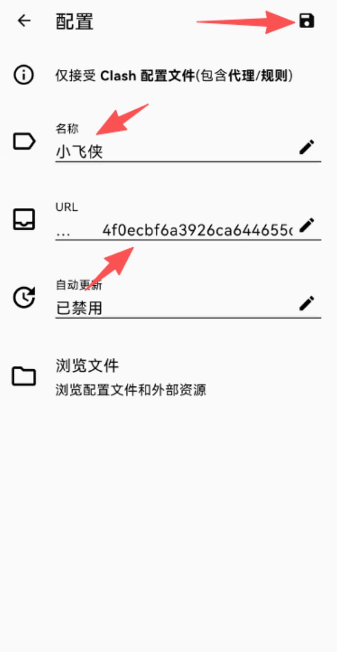 <填写名称>,并将刚刚 复制的订阅链接 <粘贴到URL> 处,完成后再 点击右上角的 <保存按钮>,即完成了导入订阅链接。