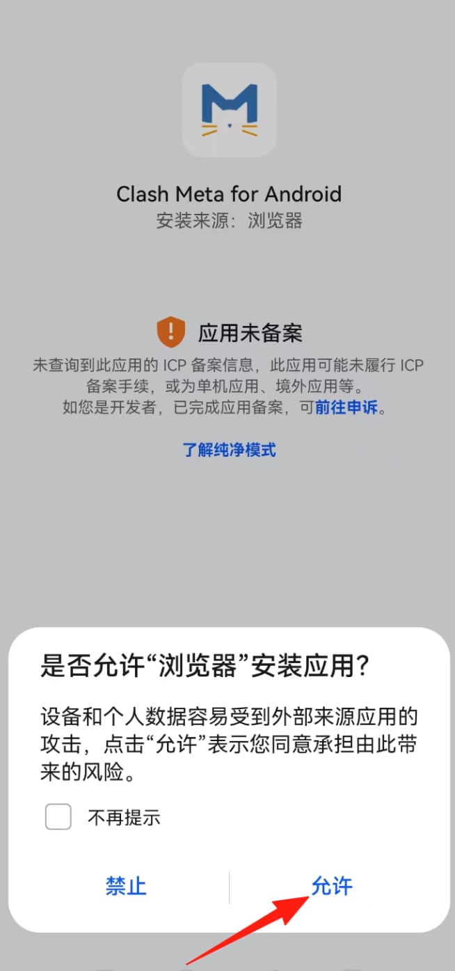 安装的过程中,如果出现 <是否允许“浏览器”安装应用?> 的提示,只需点击 <允许> 即可。
