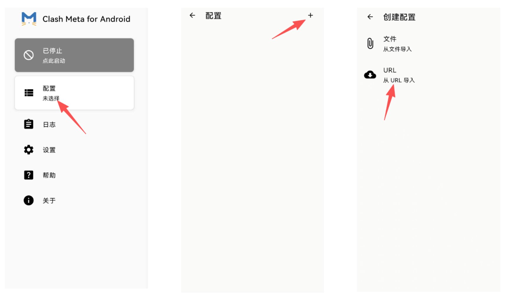 打开已安装的 <小飞侠客户端(Clash Meta for Android)>,进入到 <配置> 页。再点击 右上角的 <+ 号按钮>,接着点击 <从URL导入> 按钮。