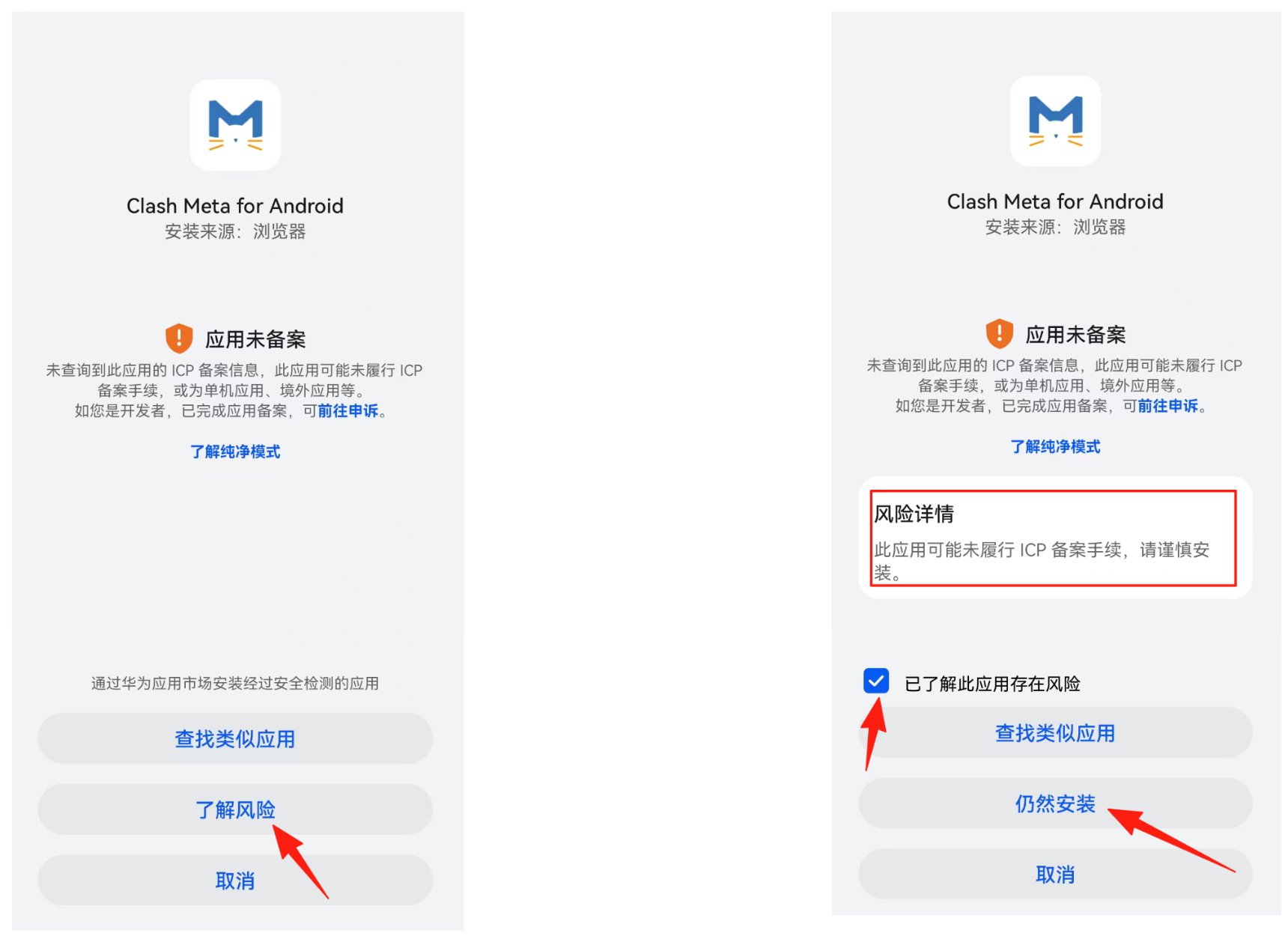 若被告知 <应用未备案>。此时,先点击 <了解风险> 按钮;接着再勾选 <已了解此应用存在风险> 勾选框;然后,点击 <仍然安装> 按钮即可。