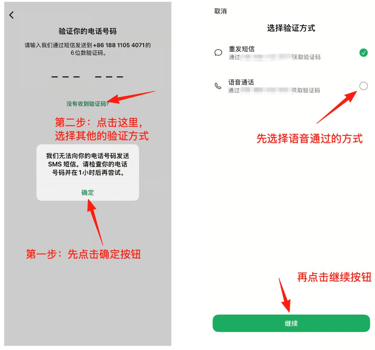 选择语音通话的方式,接收验证码。正常情况下,这时就会有电话打进来,你接听后,会有语音告知验证码。