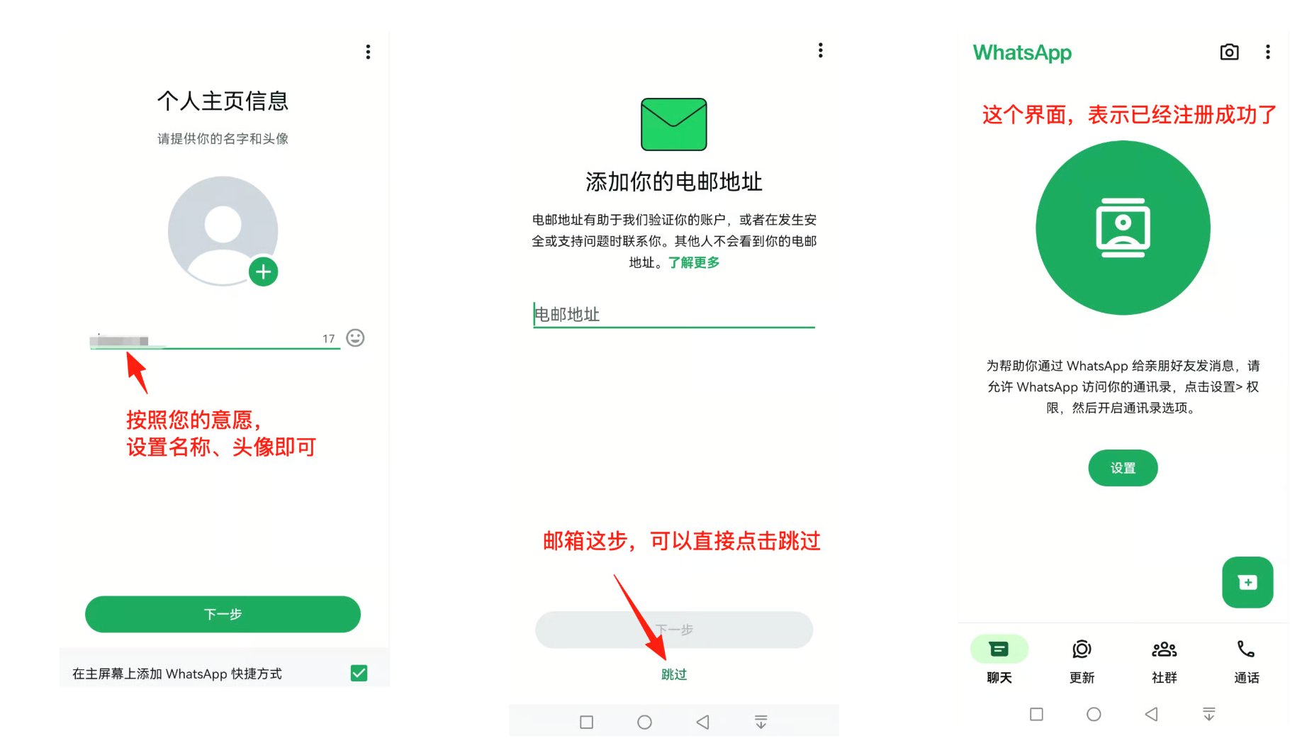 验证完成后,设置名称和头像、跳过添加邮箱。就成功注册了Whatsapp账号了。